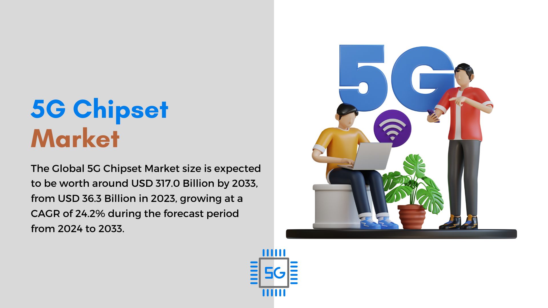 The 5G Chipset Market is poised for remarkable growth, with a projected worth of USD 317.0 billion by 2033, expanding at a notable CAGR of 24.2% from 2024 to 2033. A 5G chipset is a fundamental component of 5G technology that enables devices to connect to and utilize 5G networks. It serves as the core processing unit responsible for transmitting and receiving data at high speeds and low latency, facilitating the advanced features and capabilities offered by 5G networks. These chipsets are designed specifically to support the unique requirements of 5G, such as faster data transfer rates, improved network capacity, and enhanced network reliability.