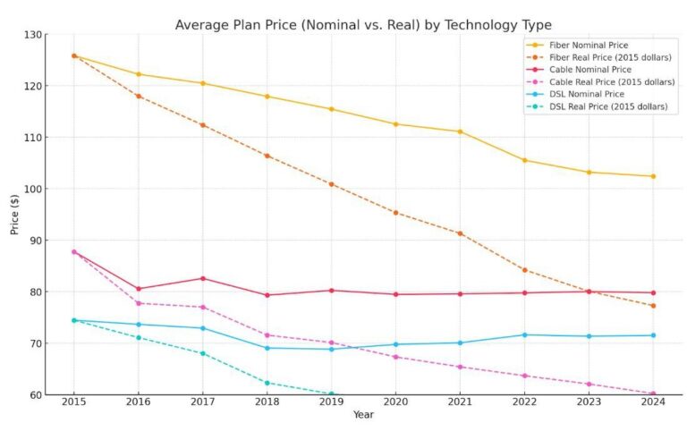 Inflation-adjusted prices for fiber optic service fell by 40%, indicating that fiber optic technology has penetrated many markets and now provides fast and reliable internet connection services.