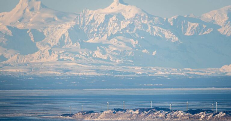 The Tordrillo Mountains rise behind Fire Island wind turbines as seen from Anchorage Hillside on January 22, 2024. (Lauren Holmes/ADN)