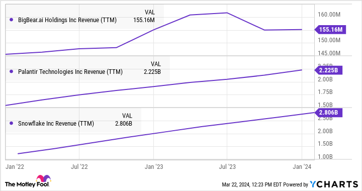 At this point, BigBear hasn’t even started the ignition process. While Snowflake and Palantir enjoyed solid revenue growth in 2023 due to the artificial intelligence (AI) boom, BigBear’s revenue growth actually slowed.