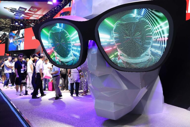 Visitors line up to try out AR glasses at the XREAL booth at 2023 MWC. CHINA DAILY