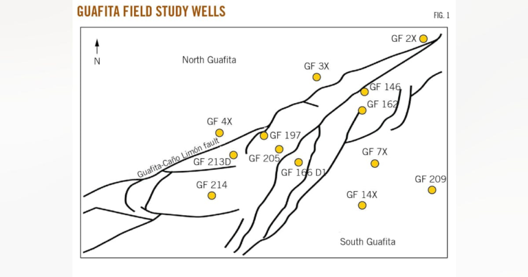 Seismic petrophysics determined the heterogeneity of the Guafita oil field, including over 200 wells, pertinent core and log data, historical well production data, and 3D seismic data over the reservoir area (70 km2). Identified. This field was discovered in 1984 and is separated by faults from the Cano-Limon field in Colombia, which contains several smaller faults (Figure 1).3 4 The Sanbi Oligocene Guafita Formation constitutes the main production unit, and the formation depth is 7,500 feet. It contains four clean compacted sand packets with average 2D permeability, 25% porosity, and a total thickness of 760 feet. The specific gravity of the oil is 29° API. Thirteen wells were analyzed in the field to determine the reservoir structure.