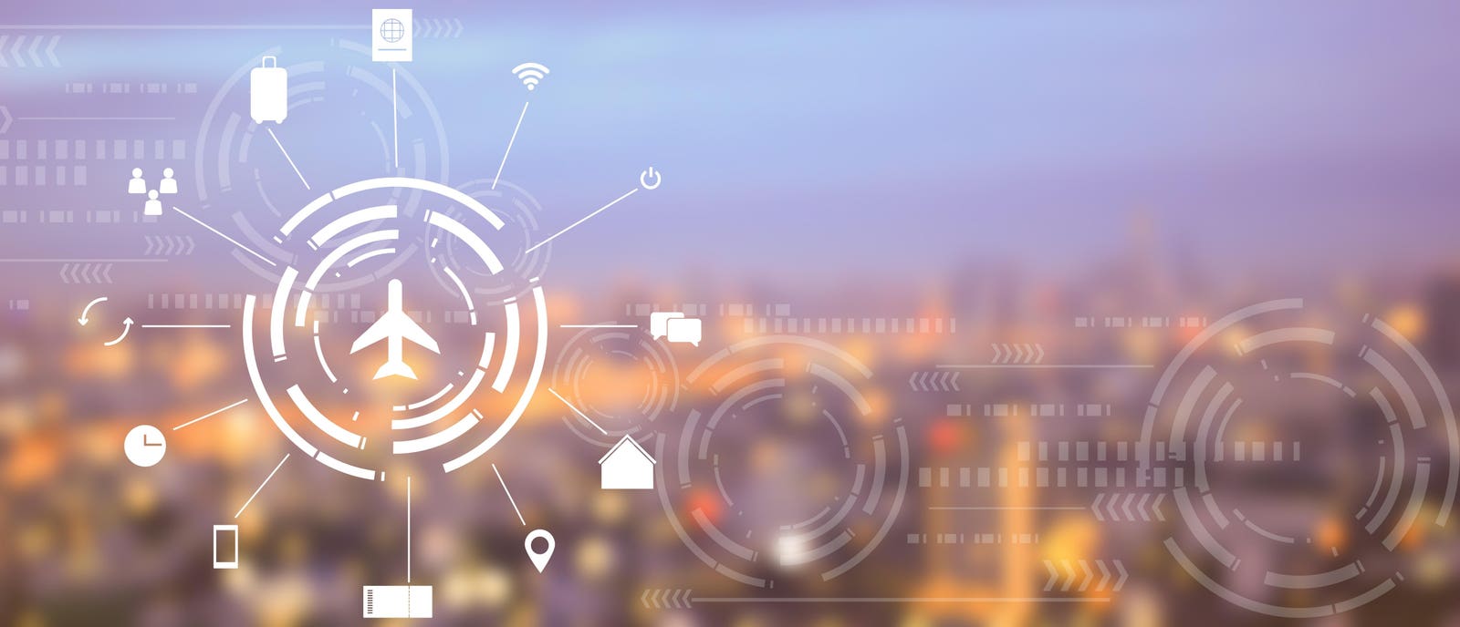Background view of city from airplane window with abstract blur night sky lines and virtual symbols … [+]