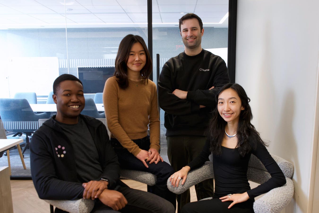 Left to right: Founding engineers Michael Opara and Lauren Kim. Alan Cowen, Founder and CEO. Janet Ho, COO and chief scientist, is building “emotionally intelligent” AI models.