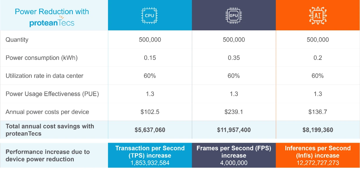 Impact: The integration of proteanTecs can result in 12% power savings per AI accelerator, which can equate to $8,199,360 in annual data center cost savings.