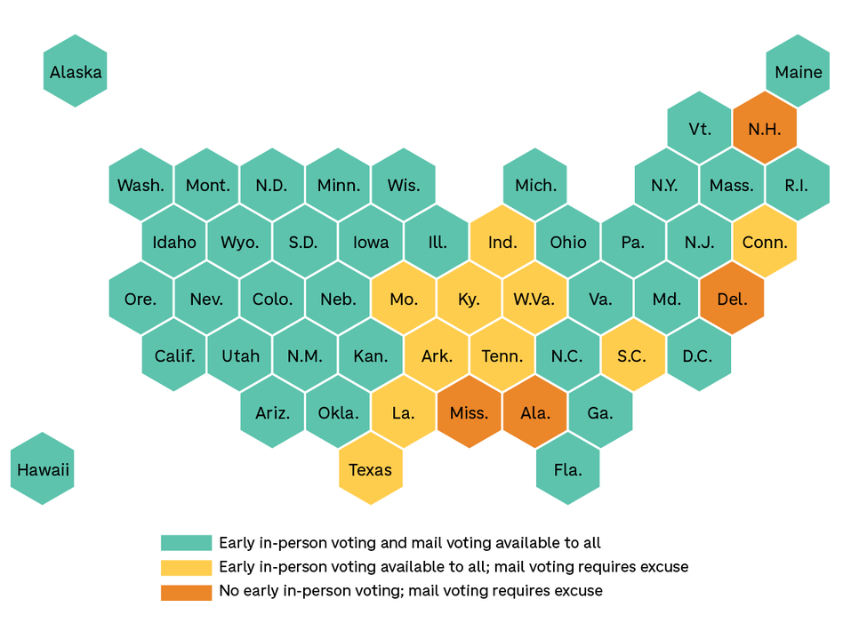 But perhaps the more striking trend is geographical. States in the Western United States have offered some form of early voting and mail-in voting to all voters since 2004, according to the data. And those states span the political spectrum, from conservative Idaho to liberal California.