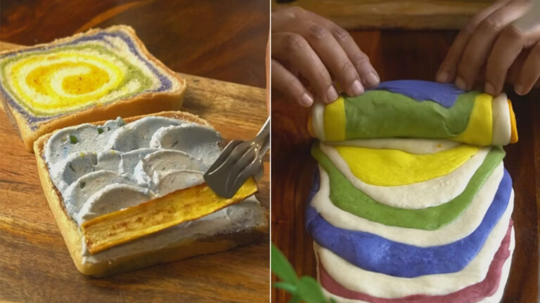 After kneading the dough, she divides it into equal proportions. To make yellow bread, she adds turmeric powder to the dough and kneads it again. Similar process is repeated for other colors. I added matcha powder for the green color. Pink was obtained from beets, orange from saffron, and blue from green peas. Before putting it in the oven and baking it, Sahini rolls up different colored dough layers and forms them into a cylindrical shape. This will later be converted to a swirl effect. In the video, she is shown slicing fresh bread and spreading a blue-colored spread on it. For her stuffing, she used slices of tomatoes, cucumbers, onions, etc. Holi sandwich is ready to enjoy.