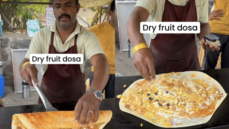 If there is one South Indian delicacy that instantly lifts our mood, it has to be dosa. The outside is crispy and the inside is filled with toppings, so it melts in your mouth from the first bite. No doubt, this snack is irresistible. Butter, rava and masala dosas are the most popular, but have you ever heard of dry he fruit dosas? If you scratch your head hearing this name, you’re not alone. Recently, a food vlogger named Sukrit Jain took to Instagram to share a video featuring a street vendor preparing a dosa topped with dry fruits and lots of cheese. “You must try this dry fruit and cheese filled masala dosa,” he wrote in the caption.