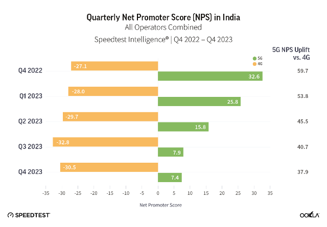 According to Ookla’s Speedtest Intelligence data, the NPS of 5G users in Q4 2023 was similar for both operators, at 7.4 for Reliance Jio and 7.5 for Airtel.