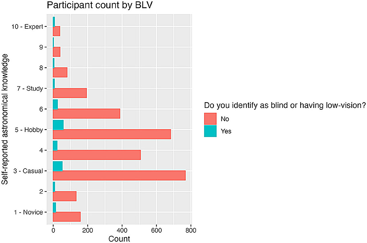 Histogram showing relative amounts of BLV and sighted subjects. Red (blue) bars represent sighted (BLV) participants. The X-axis shows the number of participants, and the Y-axis shows the self-reported level of astronomy knowledge from beginner to expert. Note the significant differences between BLV participants and sighted participants. Thirteen participants omitted astronomical knowledge or her BLV status and are omitted from this figure. credit: frontier of communication (2024). DOI: 10.3389/fcomm.2024.1288896